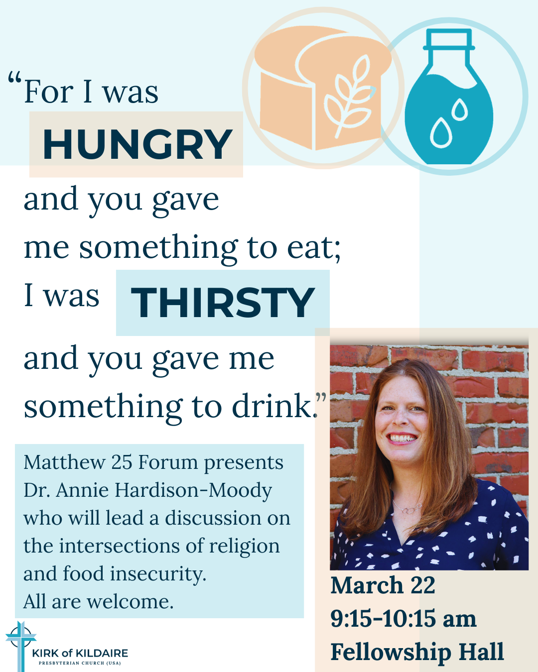 In these verses, Jesus offers six moments where we encounter him: among the hungry, the thirsty, the stranger, the naked, the sick, and the incarcerated. Throughout this year, the Kirk will host Matthew 25 Forums where we will explore each opportunity to encounter Christ. The Forum will meet in the fellowship hall before worship from 9:15-10:15.